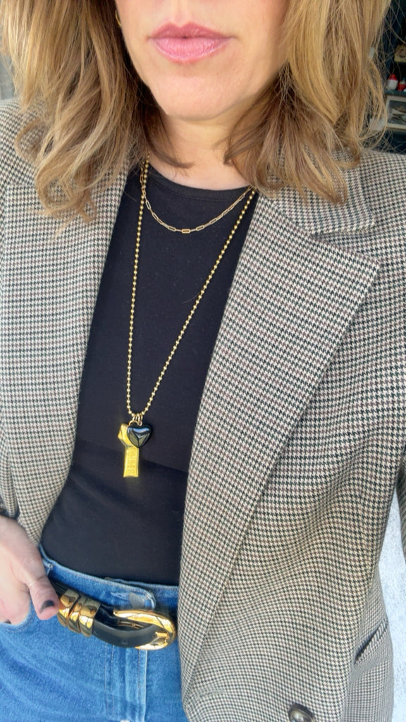 Gold Charm, with Black Heart on long ball chain