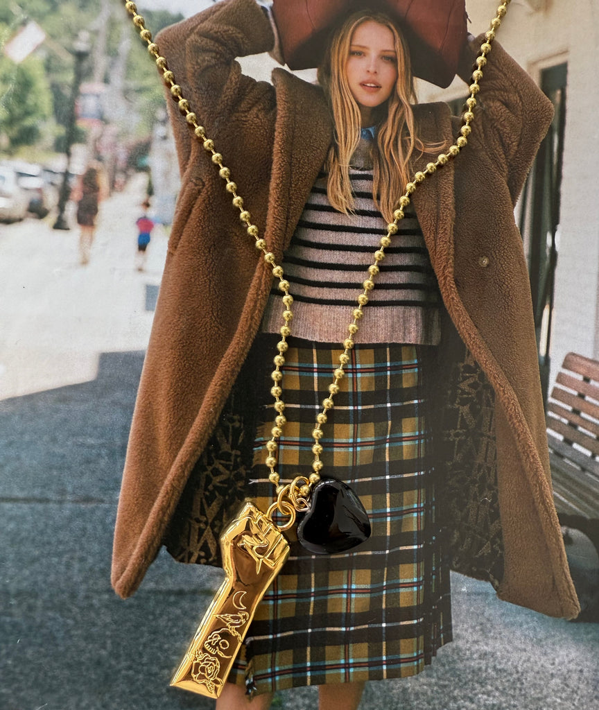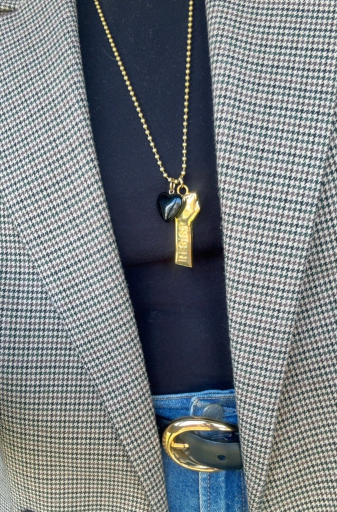 Make a bold statement with our gold "Resist" fist charm necklace.   With the word "Resist" inscribed on one side, it serves as a symbol of empowerment and solidarity. Perfect for those who champion women's rights. This necklace is both a fashion accessory and a declaration of values and principles. Ideal for daily wear or as a thoughtful gift for like-minded individuals. On the other side of the fist, features inscribed tattoos!