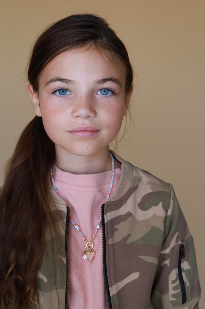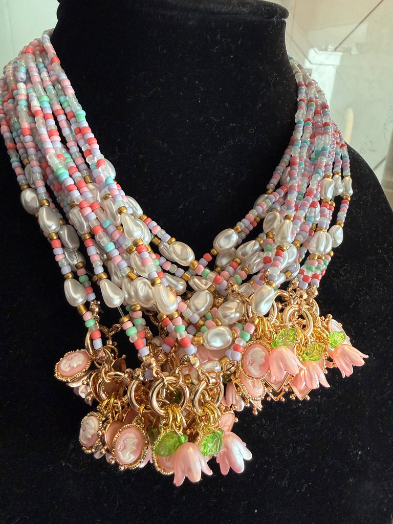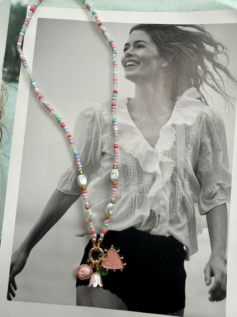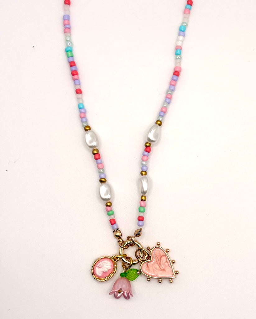 Elevate your style with our stunning Beaded Pearl Floral Heart Charm Necklace. Featuring delicate pearls, colorful beads, a charming pink heart, and elegant gold floral and cameo accents, this necklace offers a unique blend of softness and sophistication to brighten any outfit.