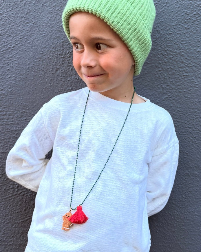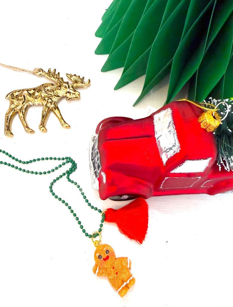 Charming and cheerful, this gingerbread necklace features a green necklace, red tassel and gingerbread textured cookie charm. Add to any holiday outfit for the perfect added accessory!